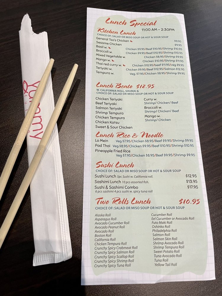 At Yummy Fusion, the menu showcases a range of offerings that celebrate the best of both Japanese and Thai flavors. Dive into their sushi selections, where options like the Sashimi Dinner and unique rolls cater to a variety of tastes. Customers rave about dishes like the red curry and the zen roll, which incorporates innovative ingredients to please even the most discerning palates. For a satisfying lunch, try the Two Roll Lunch or the Sushi & Sashimi Lunch Combo, available at reasonable prices.